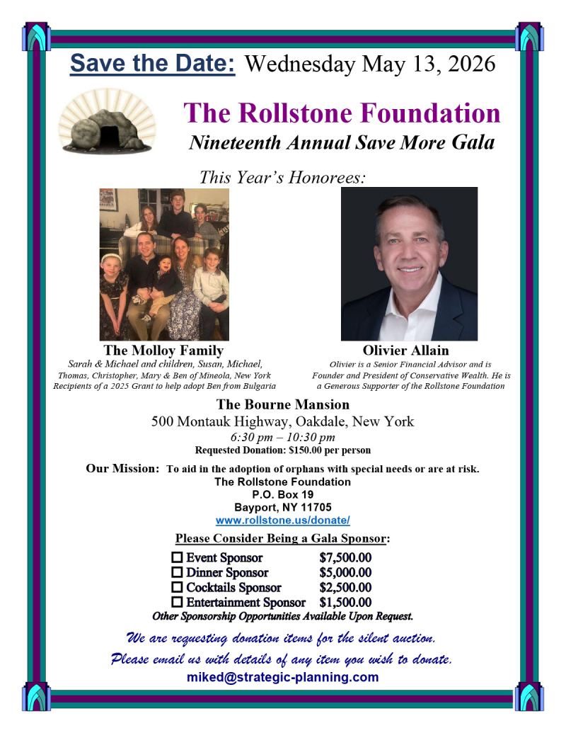 250 supporters helped to pack the Mansion at Timber Point in Great River to help support the work of the Rollstone Foundation. This year's honorees were Linda & Vincent Leuzzi. Linda is an Award-Winning Journalist & Author and Vinny is a former V.P. of Software Support & Computer Security. Both have been generous supporters of the Rollstone Foundation. Our family honorees were Emily & Micah Brokaw of Hughesville, Pennsylvania. Emily received a Rollstone grant in 2024 to help adopt Micah from Bulgaria.
